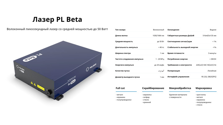 В 2021 году компания расширила линейку продуктов. Был разработан волоконный импульсный лазер PL Beta. Короткие импульсы лазеров «Поларус» (40 пс) позволяют обрабатывать материал с точностью до 1 мкм методом холодной абляции. По сравнению с твердотельными лазерами волоконные более надежны и компактны. Лазеры «Поларус» подходят для обработки различных материалов и для микроэлектроники. С их помощью можно выполнять скрайбирование, резку, гравировку, сверление и другие задачи, в том числе микрообработку кремния, полупроводников и керамики.