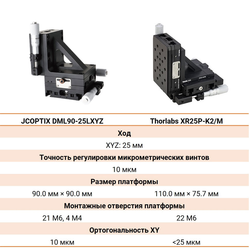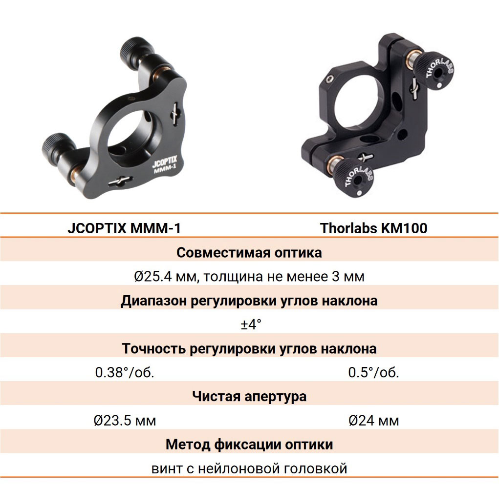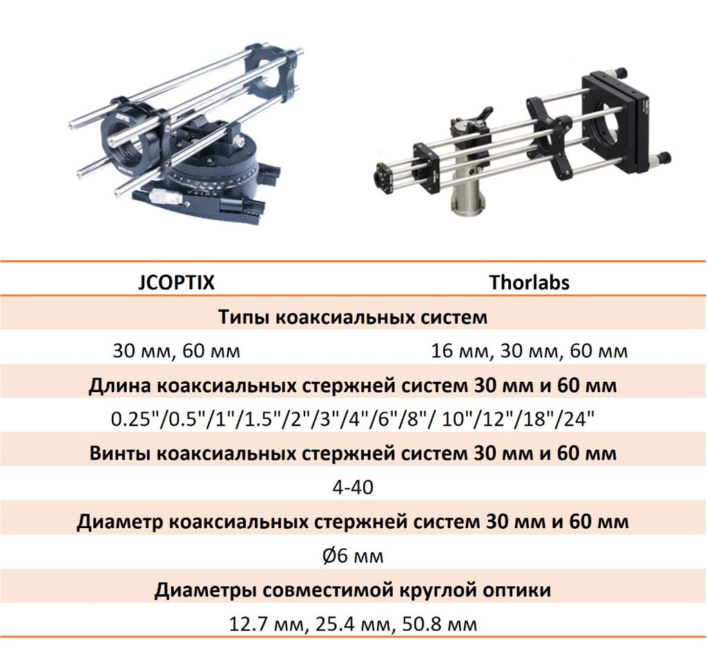 Кинематический держатель оптики KM100 Thorlabs предназначен для двухосевой угловой регулировки оптических компонентов диаметром 1” в диапазоне ±4° с точностью 0,5°/оборот, конкурент MMM-1 JCOPTIX превосходит «европейский аналог» с точностью 0,38°/оборот. Компоненты JCOPTIX для коаксиальных систем 30 и 60 мм полностью повторяют ассортимент и размерную линейку Thorlabs, что также упрощает интеграцию в уже построенные схемы. Стандартные линейные трансляторы JCOPTIX оснащены микрометрическими Mitutoyo прецизионной точности, что позволяет не уступать в привычной точности при выборе данного производителя.