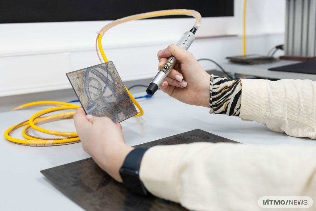 Фото: ИТМОНа мастер-классах участники учились наносить гравировку на металл, стекло и пластик, создавать рельефные изображения и экспериментировать с лазерной кистью – устройством, разработанным в ИТМО. Эта технология позволяет «рисовать» на поверхностях с точностью до микрона, используя более 20 оттенков без применения красителей.